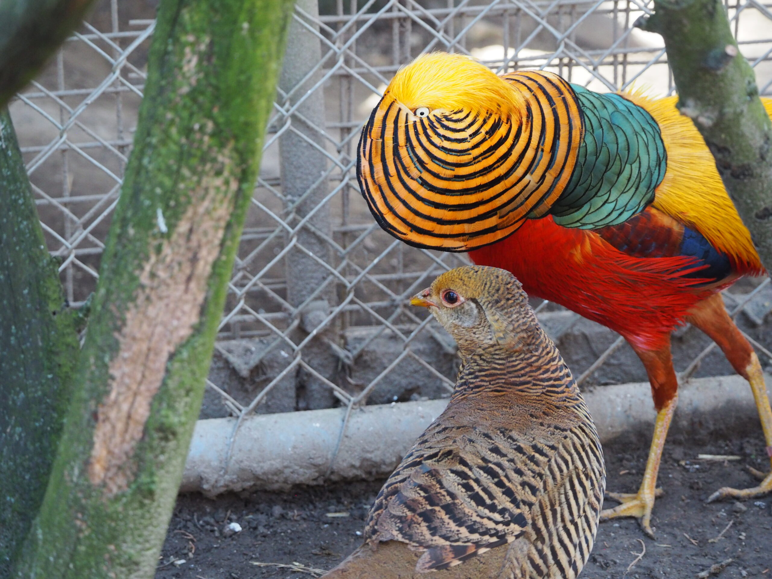 Mario est notre mâle faisan doré. C’est un vrai dragueur ! Il fait la cour à toutes les femelles, qu’il s’agisse de faisan, de poule ou de paon ! Il est magnifique… et il le sait !