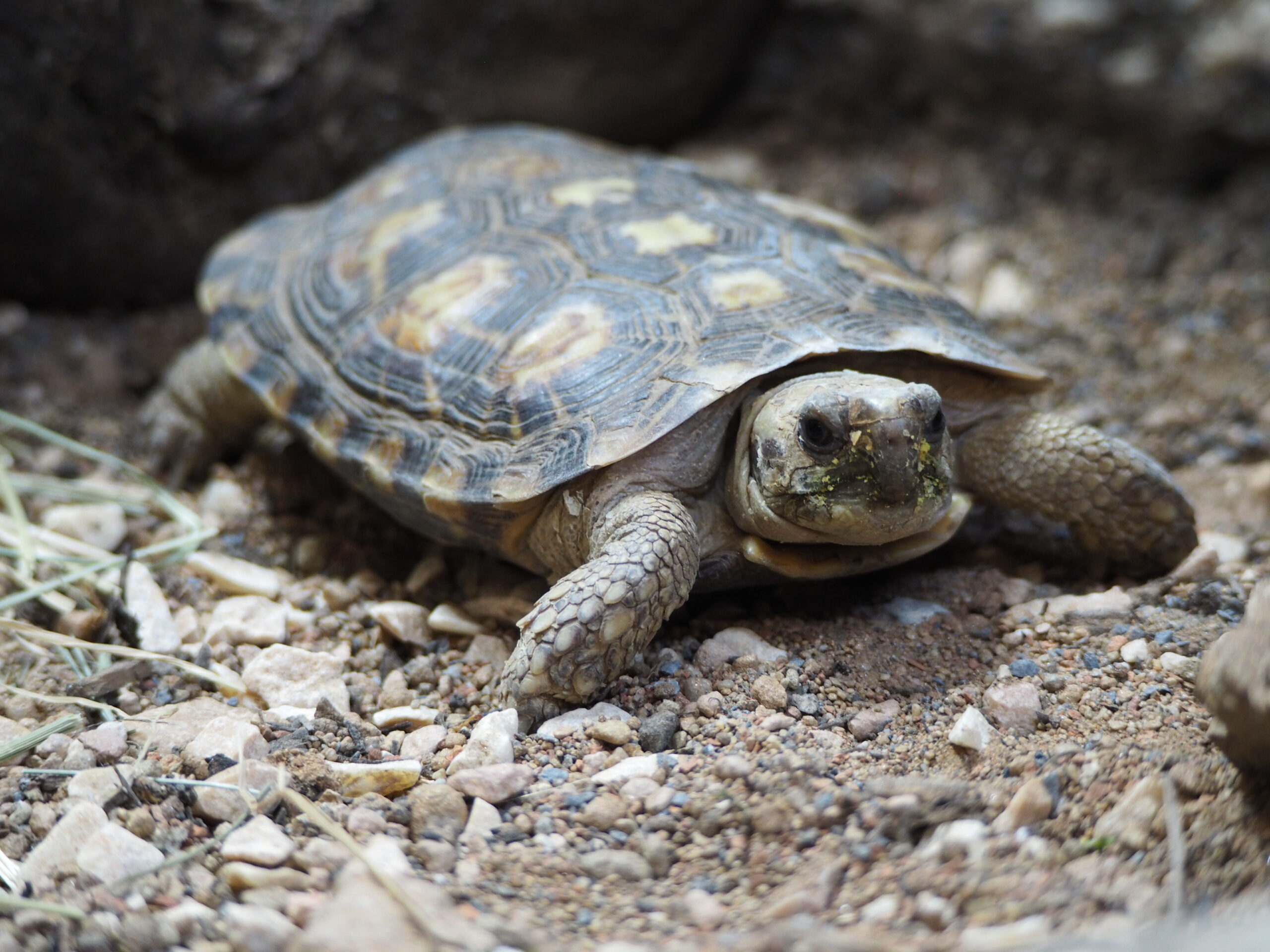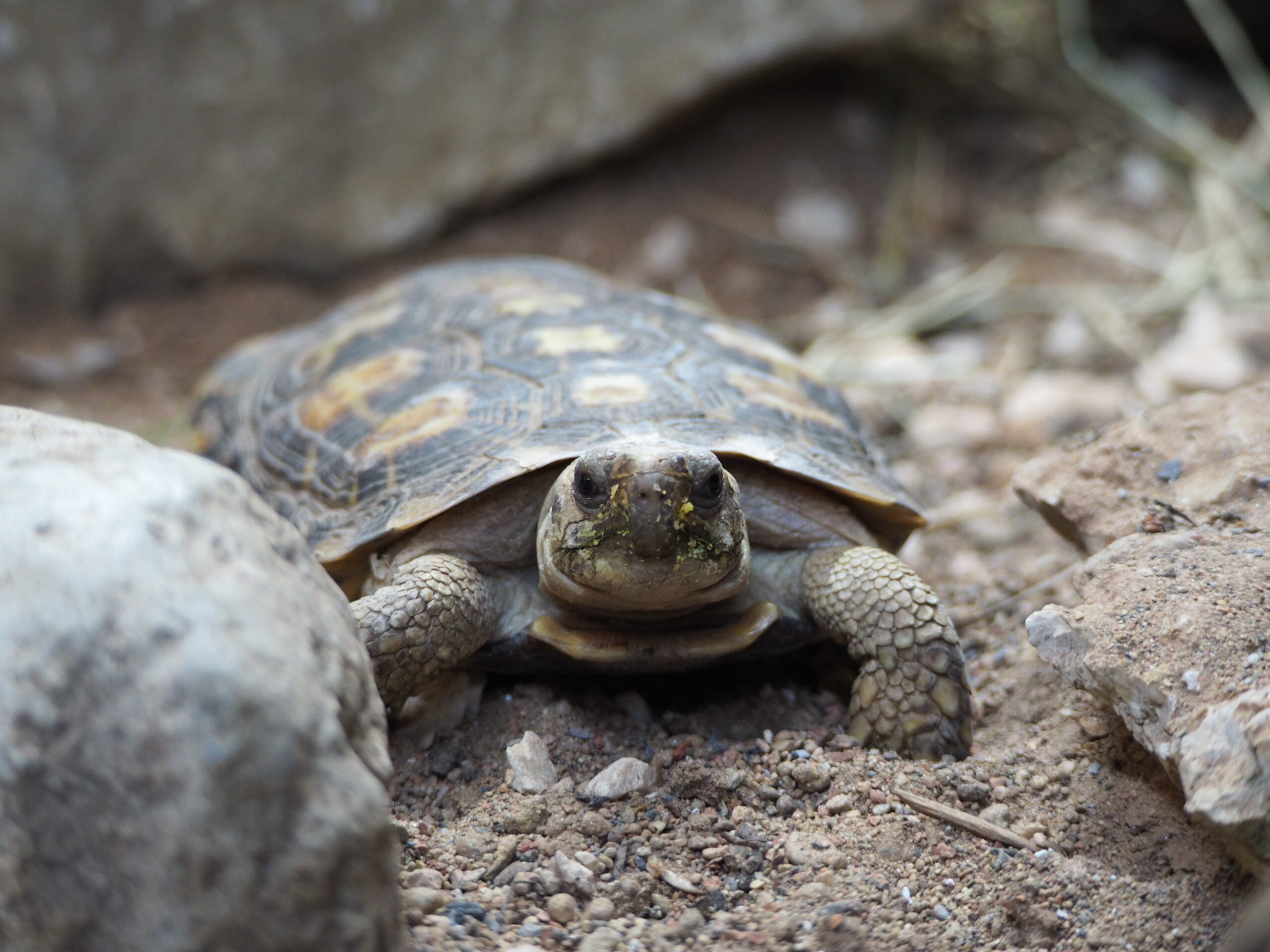 Suzette est une femelle tortue crêpe, sauvée du John’s kleine Farm. Ce parc, qui était situé dans le canton de Berne, a dû fermer ses portes au mois d’août 2024 dans l’urgence et le Bioparc est alors venu à son secours. Son espèce est gravement menacée d’extinction à l’état sauvage.
